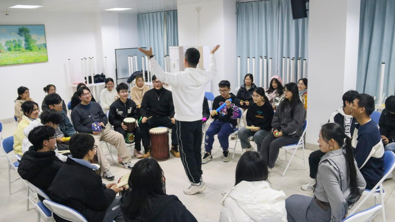 在活动伊始,陈雯老师以《幸福拍手歌》一曲进行了暖场小游戏,营造出轻松愉快的氛围。本次活动共设有四个环节:聆听与述说、鼓圈体验、陶笛演绎以及音乐想象。在活动开始后,同学们在陈雯老师的引导下围坐成大小两个同心圆。随着优美的音乐声响起,同学们面对面敞开心扉诉说着自己的心里话,相互之间用言语表达赞扬,现场气氛活跃而融洽。随后各位同学挑选一种乐器进行“鼓圈体验”活动。同学们在李凯老师的带领下用手中的乐器与其他同学亲密合作,共同演奏出优美的曲调。接下来在“陶笛演奏”环节中,陈雯老师手持陶笛为现场的同学们演奏出一曲动人心弦的旋律,同学们沉浸在美好的音乐声中。最后的音乐想象环节中,同学们闭上双眼,放松身心,优美的音乐声在耳畔回绕,随着李凯老师的指令,同学们仿佛身处于蓝天白云的大草原之中,放松了身心。